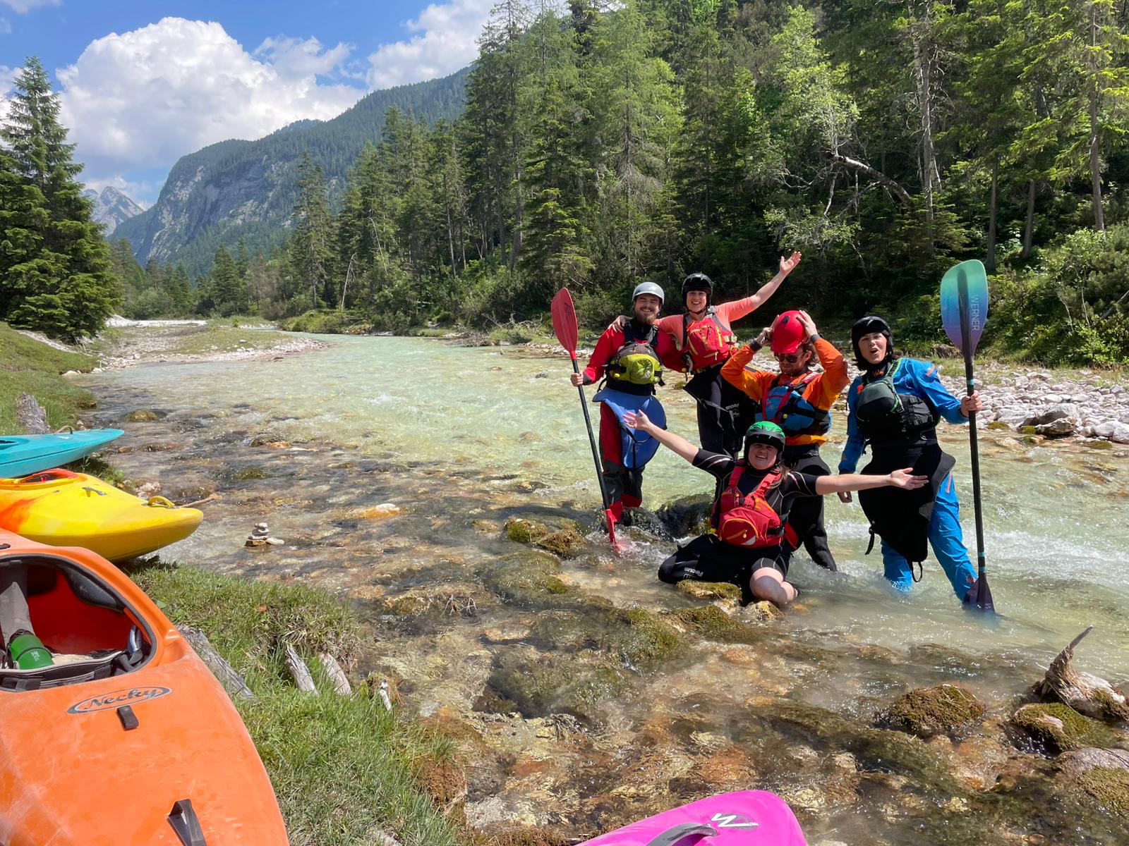 Die ersten beiden Tage verbrachten wir an der oberen Isar. Einstieg war mitten im Naturschutzgebiet – erreichbar nur per Boots-Taxi. Während wir zu Beginn mehr Steine als Stromschnellen erlebten, wurde es später flotter und durchaus technisch anspruchsvoll. Es war so schön, dass wir die gleiche Strecke am zweiten Tag direkt nochmal fuhren. Diesmal mit einer Kenterung in 30 cm tiefem Wasser direkt nach dem Einstieg, kurzfristiger Paddelverlust inklusive. Eine sportliche Höchstleistung, wenn man bedenkt, dass man dort theoretisch auch hätte stehen können. In der Gleirschklamm machten wir Pause, badeten im Fluss und trainierten Wurfsack werfen mit drei Metern Seil. Mehr brauchten wir nicht – aber wir wären bereit gewesen!